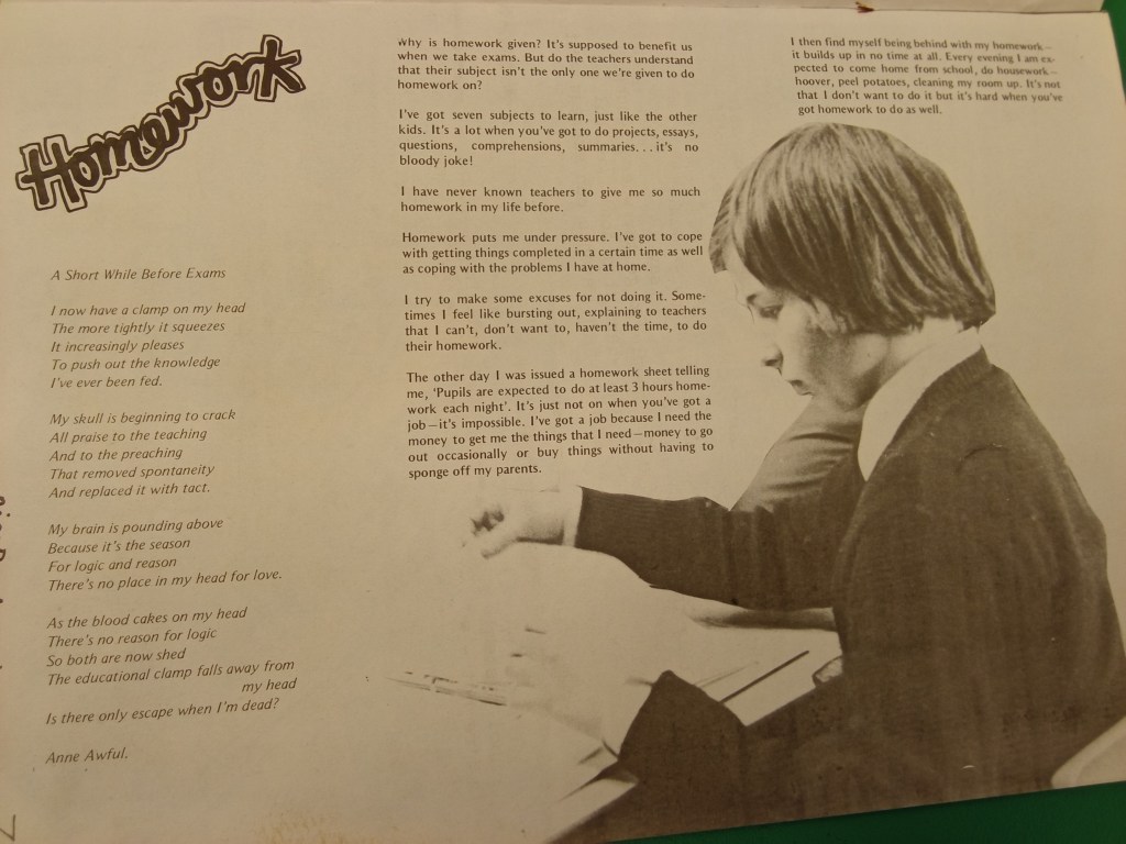 Joi am sapat intr-una din cutiile pe care scria ”Schooling & Culture”. Am facut vreo 200+ de poze, dintre care au ramas cu mine cele de mai jos: prima, pentru ca se leaga cu discutia despre cum trebuie sa fii ca “sa reusesti”, orice ar insemna asta – si care se leage de refrenul cu “Eastern Europeans are really hard working” . A doua, pentru ca ofera o forma foarte interesanta de document – care reproduce o discutie dintre, de exemplu in cazul acesta, cateva eleve in legatura cu sexismul experimentat intr-una din primele scoli “mixed gender”, la sfarsitul anilor 1970. Iar a treia pentru ca problematizeaza ideea de “teme” intr-un mod minunat, si – mai ales – cu vocea unei persoane tinere. Ca parinte care de multe ori poate fi prins in jocul de putere “Fa-ti temele pentru ca asa trebuie!”, cred ca perspectiva asta poate fi tare folositoare din cand in cand – macar pentru a lasa loc de exprimare celor fata de care ne aflam intr-o pozitie de putere.