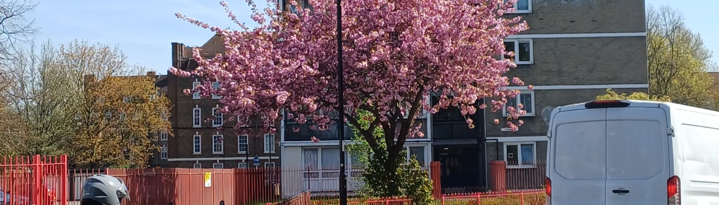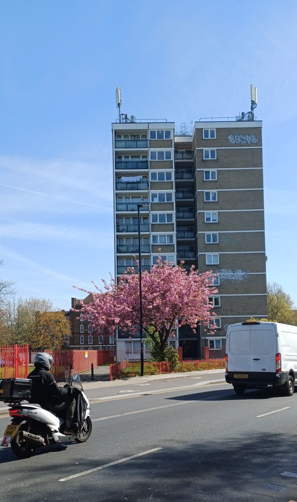 ( Poza reprezintă ce văd când ies din casă, de multe ori cu căștile de telefon pe urechi- sau mai bine zis ce vedeam în cele două săptămâni cât superbul de peste drum a stat înflorit)